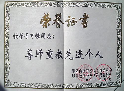 2001年9月即墨市经济开发区工委、即墨市经济开发区管理委员会授予于可强“尊师重教先进个人”荣誉称号