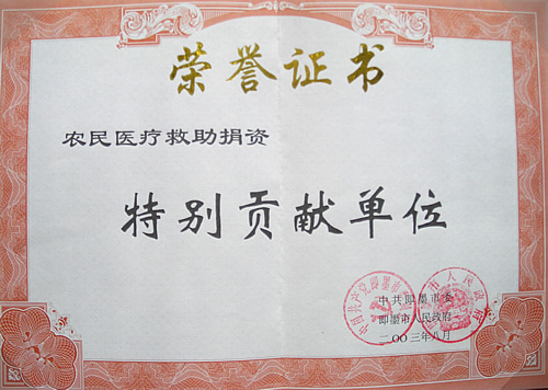 2003年8月被即墨市委、即墨市人民政府授予“农民医疗救助捐资特别贡献单位”荣誉称号