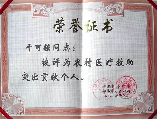 2004年8月即墨市委、即墨市政府授予于可强“农村医疗救助突出贡献个人”荣誉称号