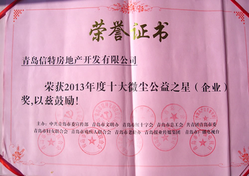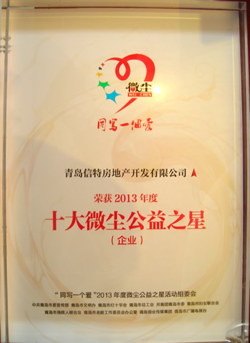 青岛市委宣传部、青岛市文明办、青岛市红十字会、青岛市总工会、共青团青岛市委、青岛市妇女联合会、青岛市残疾人联合会、青岛市老龄办、青岛报业传媒集团、青岛广播电视台授予2013年度“十大微尘公益之星”荣誉称号